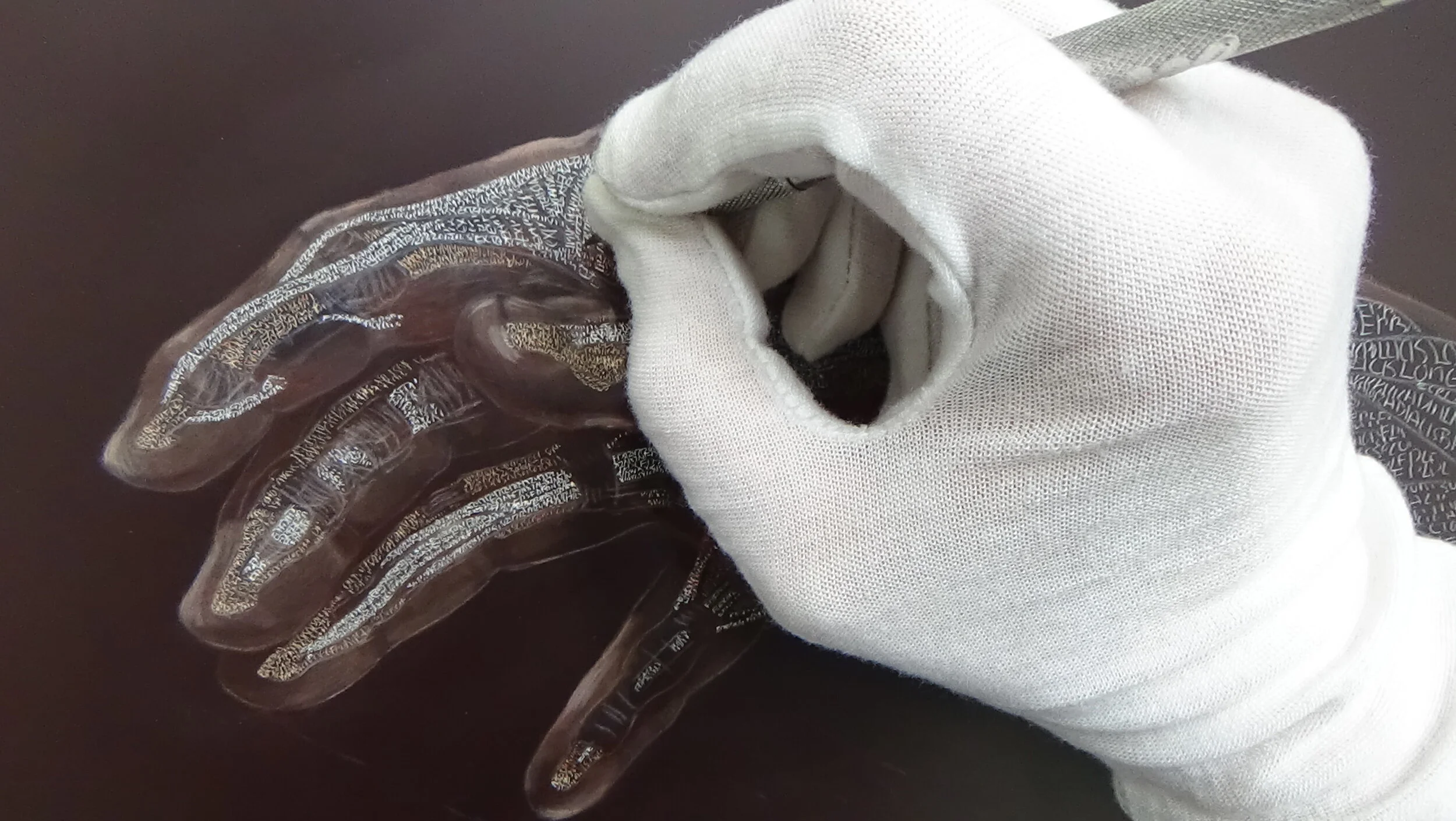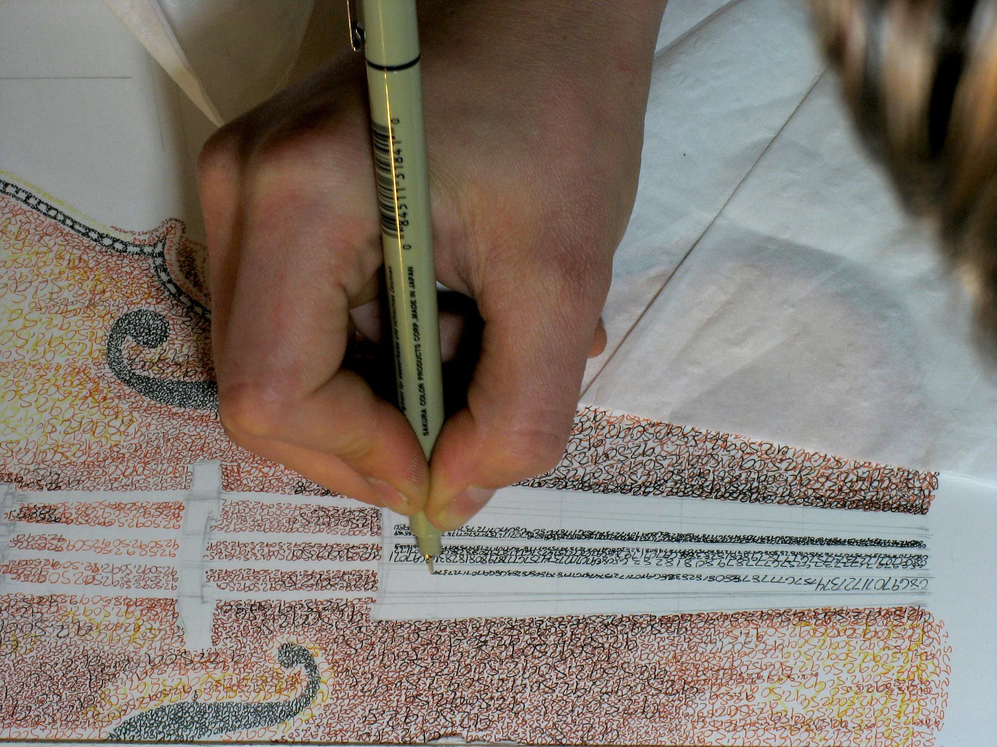 Scratchboard is an archival drawing substrate consisting of a layer of white clay coated with black ink. Sienna scratches numbers and equations through the ink using fine blades, thus revealing the white clay beneath which is later stained with with ink or watercolor.