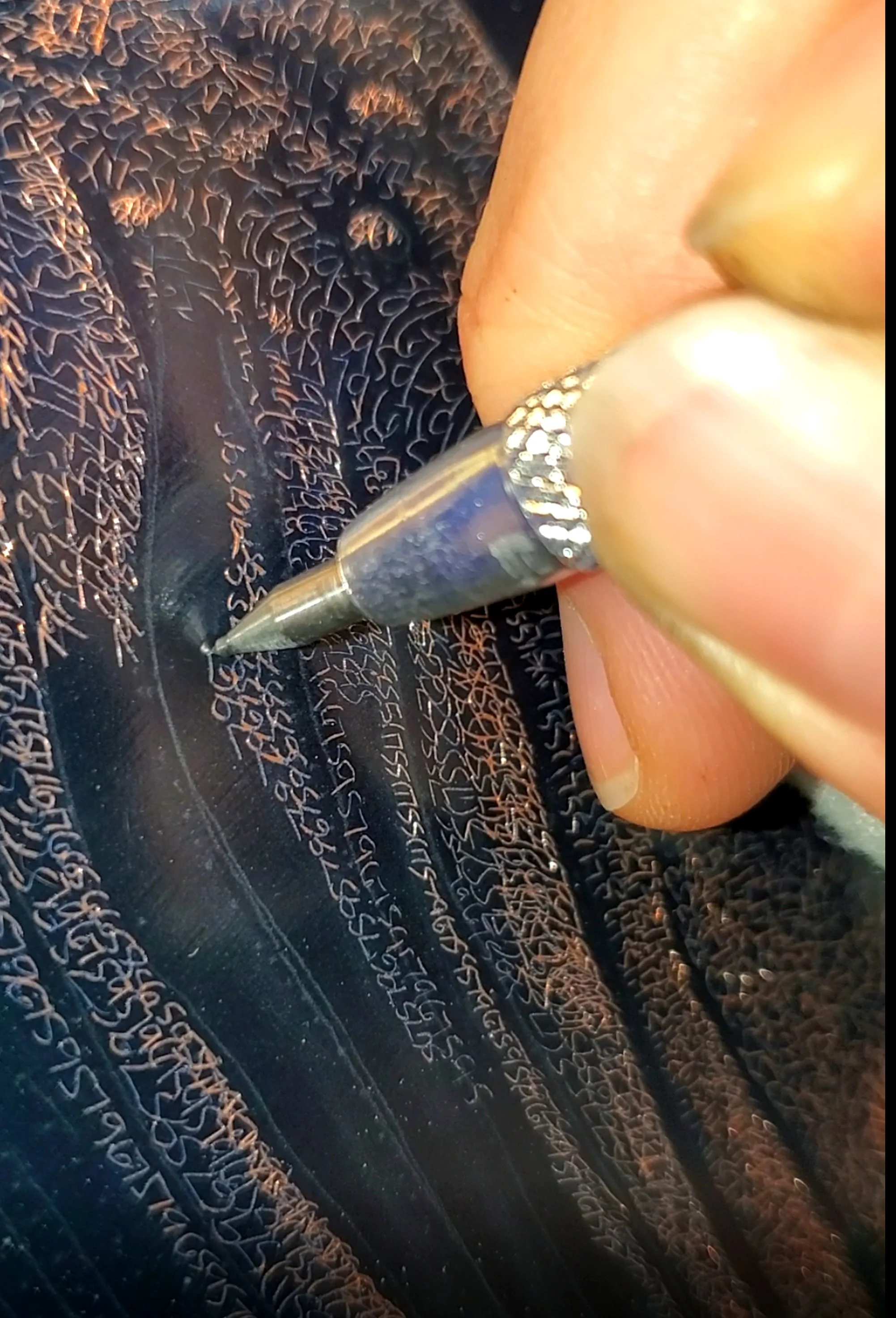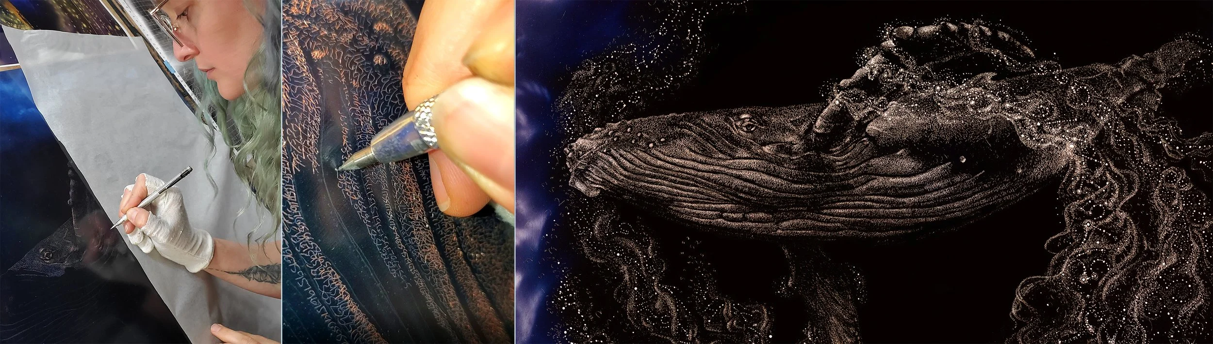 Photos of Sienna hand engraving the “Lonely Whale” on copper plate. This was composed by writing the pitch and rhythm of his song repeatedly. Original sold.