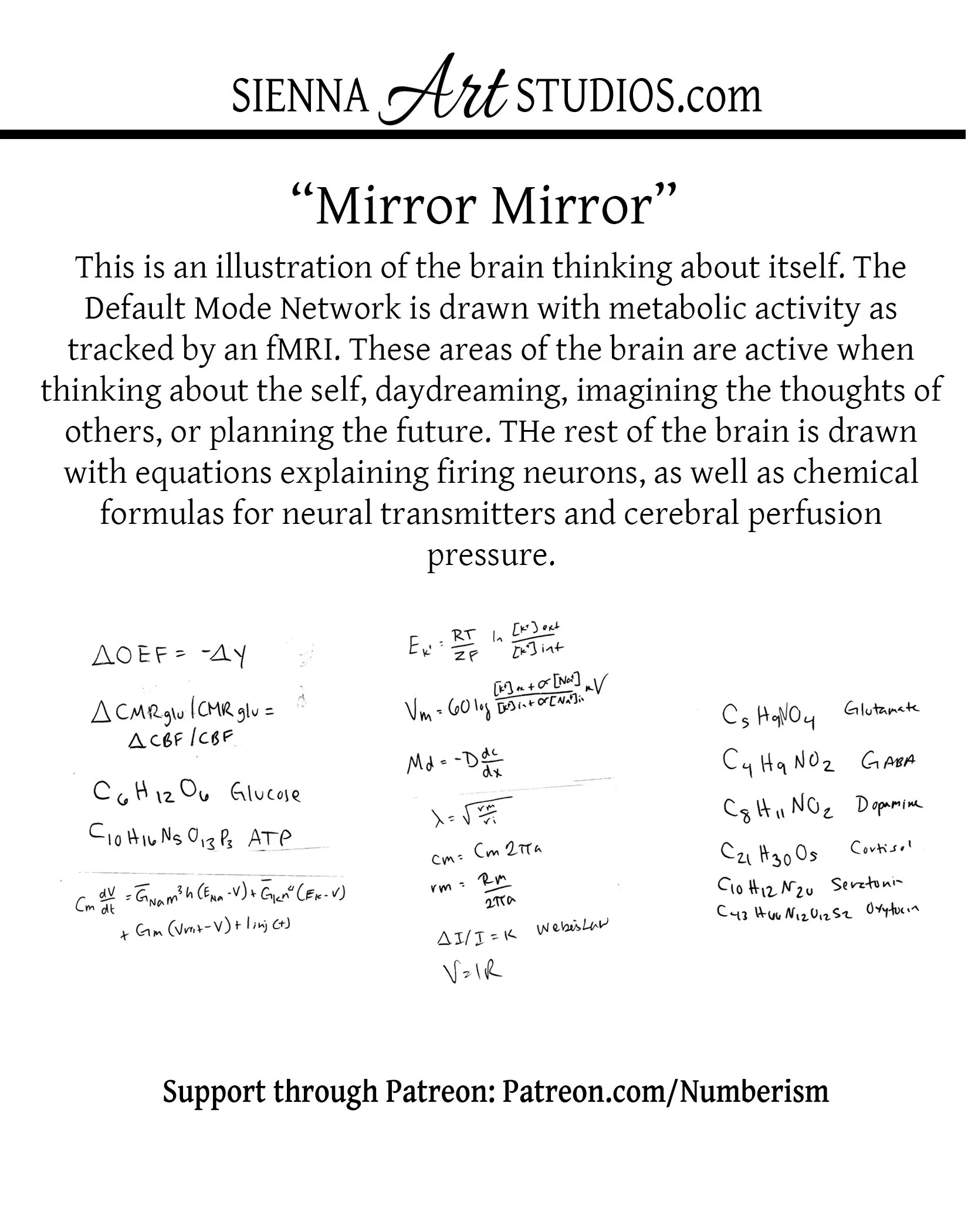 This is the original "Mirror Mirror", drawn entirely with numbers and equations by hand. Measuring 32"x40" (With the frame is is 35"x44") , the illustration is pen and color pencil on archival board with watercolor. The original comes with a certificate of authenticity and a magnifying glass, as well as a description of the numbers used to create it. Sienna painted phosphorescent paint in the Default Mode Network, so that you can see this area of the brain light up under black light or in the dark. In this way, you are looking at a reflection of your own brain as you contemplate yourself.