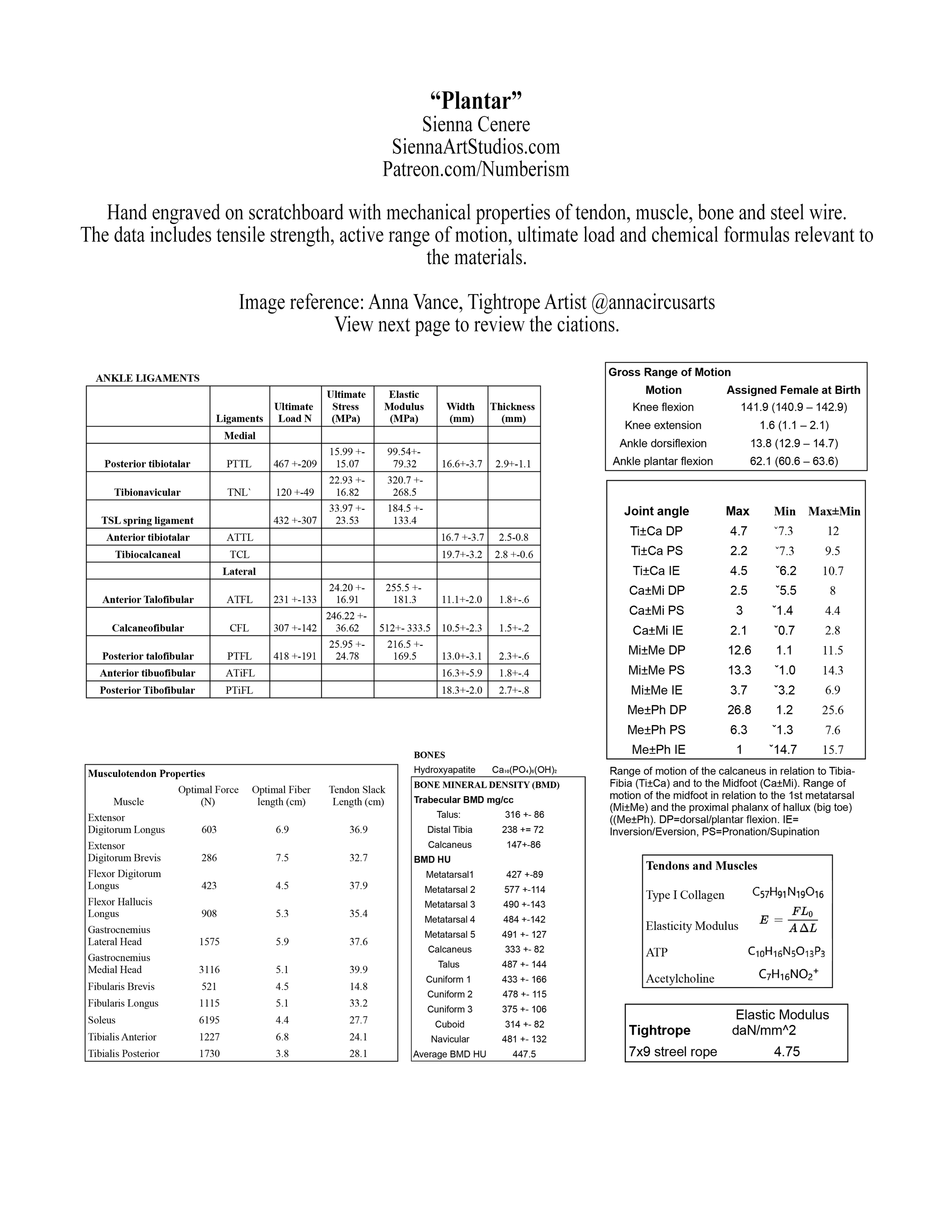 Original hand engraved scratchboard numberism etching of an anatomical tightrope walker. Drawn with mechanical properties of tendon, ligament, muscle and bone, as well as physics equations relating to tensile strength.
